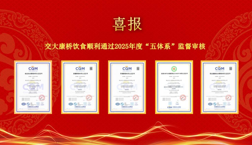 多年来,康桥饮食持续推进管理体系建设,通过专题培训、内审管理评审、标准化试点推广等方式,严格规范食品生产重点环节,彰显国企食品安全管控能力和社会责任担当。公司将以此次审核为契机,持续优化管理水平,不断提升服务质量,为公司高质量发展蓄势赋能。
