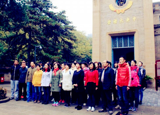全体党员登上清凉山,实地参观了中央印刷厂及新华书店旧址,追寻当年投身革命的新闻工作者为中共中央的新闻事业夜以继日奋斗的身影;在王家坪,参观了党中央在延安时期的军委礼堂、会议室及毛泽东等领导人的旧居;怀着敬仰之情,党员们来到杨家岭,行走在老一辈革命家们浴血奋战的土地上,在中共七大中央大礼堂前,党员们整齐列队,用铿锵有力的歌声高唱《没有共产党就没有新中国》,伴随着激昂的音乐,党员们唱出了对延安这片土地的热爱和对老一辈无产阶级革命家们的无比崇敬和怀念之情。