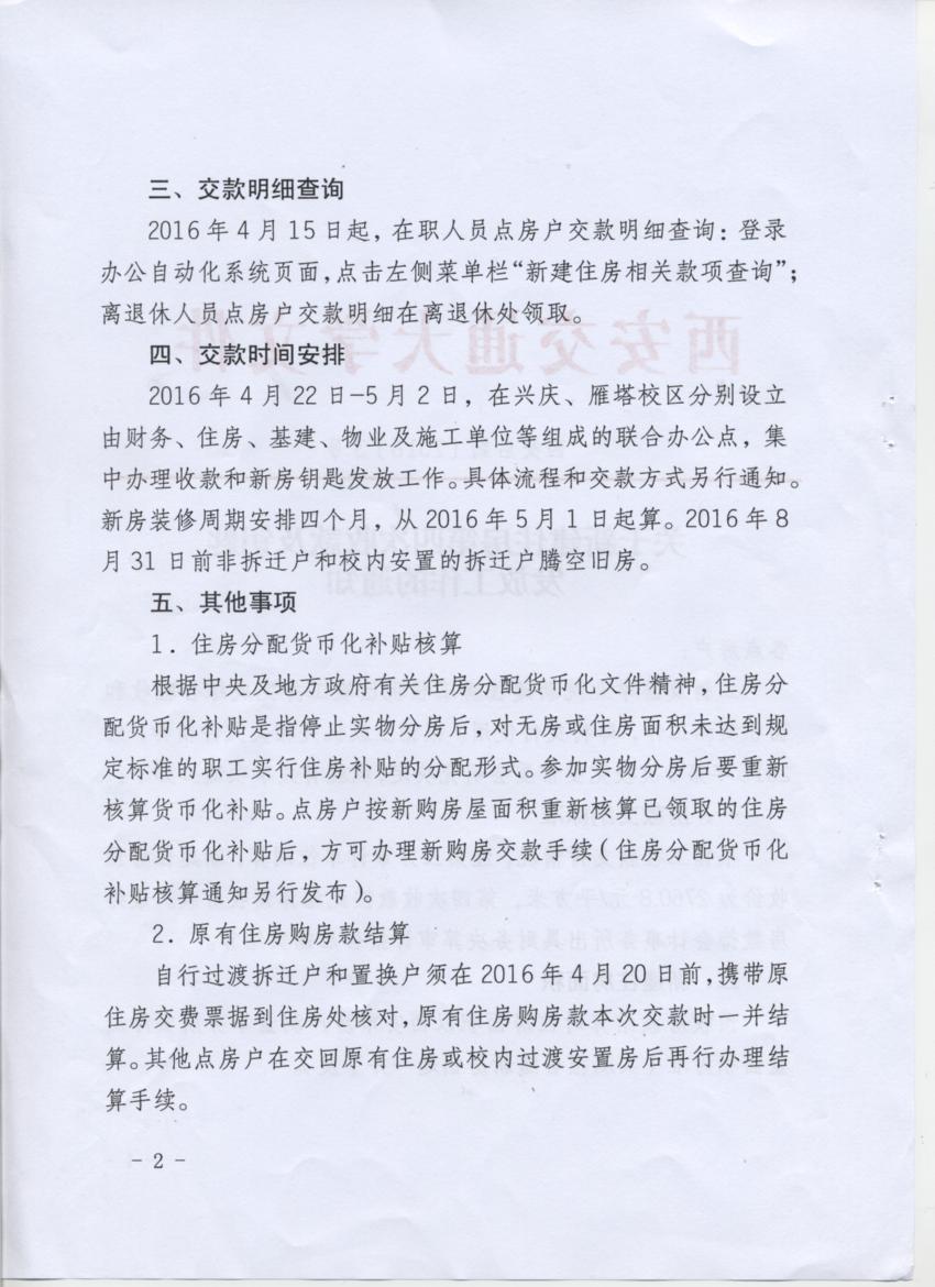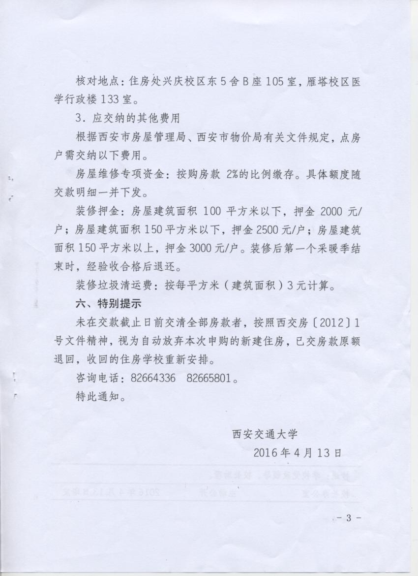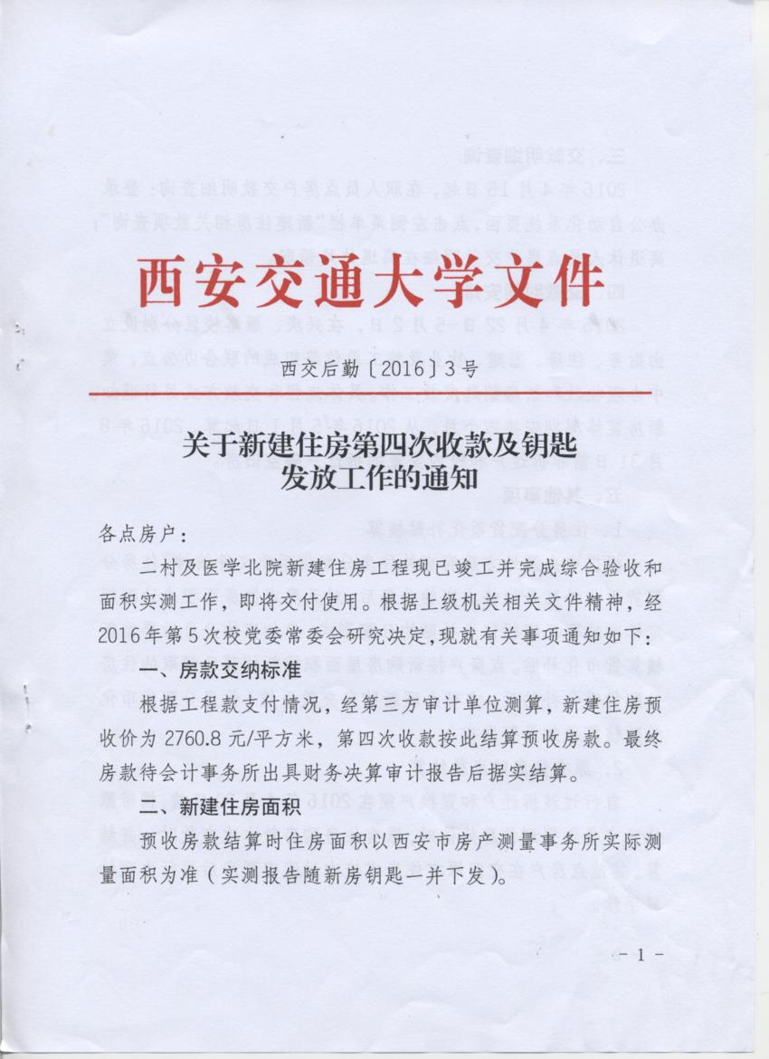 关于新建住房第四次收款及钥匙发放工作的通知-西交后勤[2016]3号