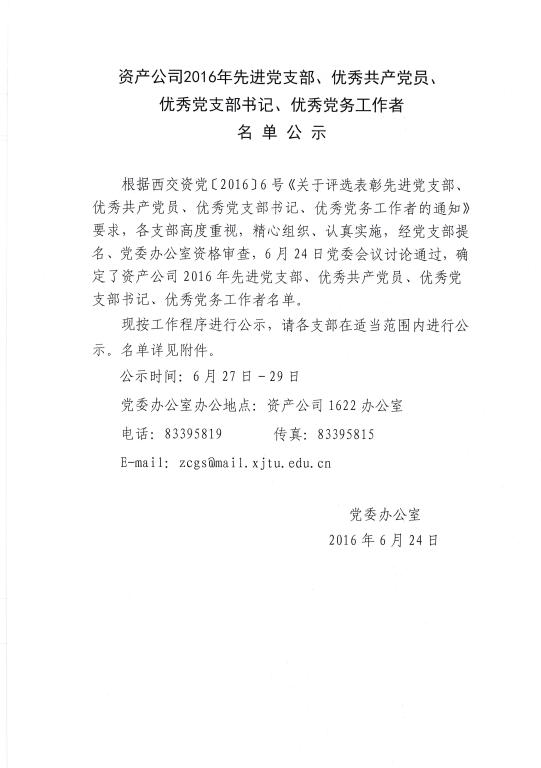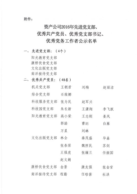资产公司2016年先进党支部、优秀共产党员、优秀党支部书记、优秀党务工作者名单公示